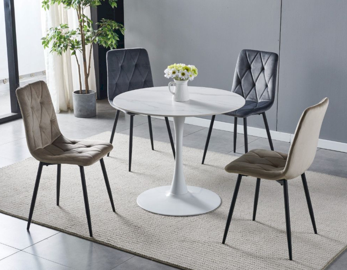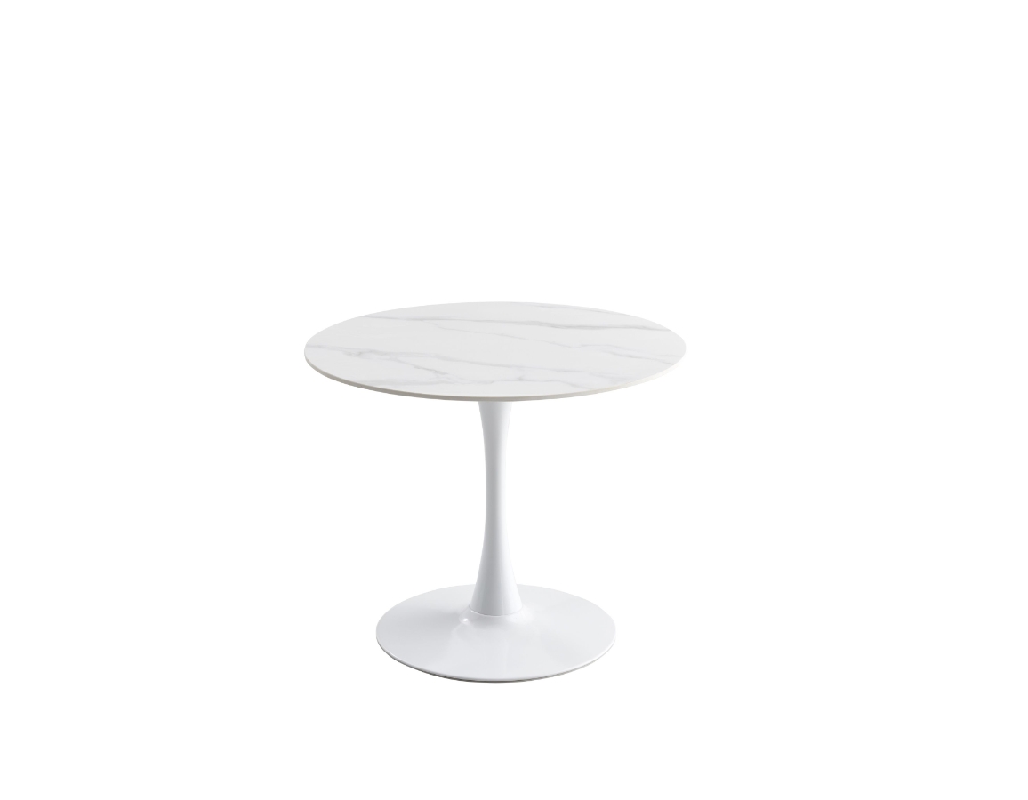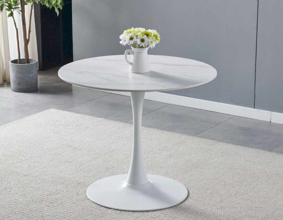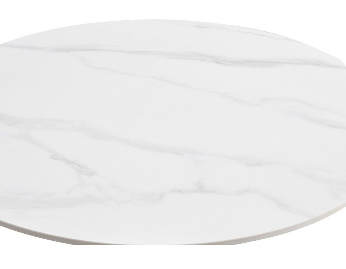 Okrugli blagovaonski stol u prekrasnoj bijeloj mramornoj boji. Ploča stola je debljine 1,2 cm, promjera 90 cm izrađena je od sinteriranog kamena s mramornim uzorkom.