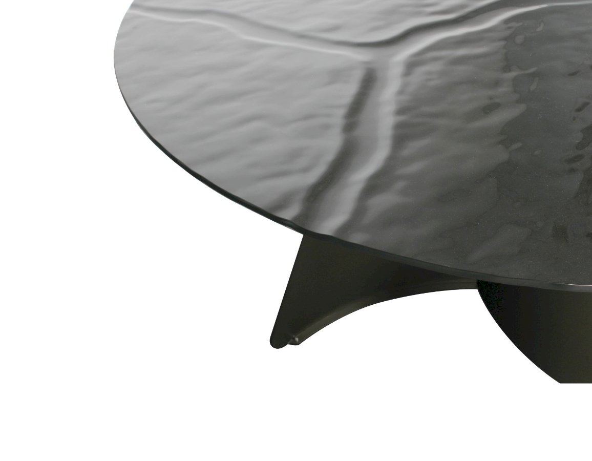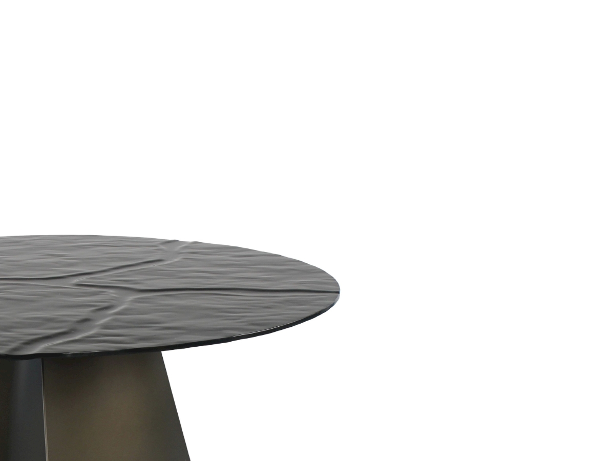 Ploča stola izrađena je od 12 mm debelog stakla, dizajniranog s neravnomjernom teksturom. Kružni oblik stola omogućuje ravnomjeran razmak i dobru interakciju, što ga čini prikladnim i za objedovanje i za sastanke.