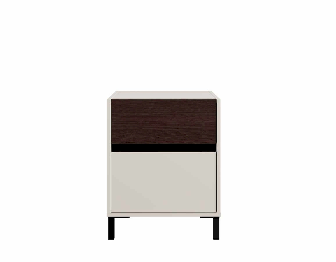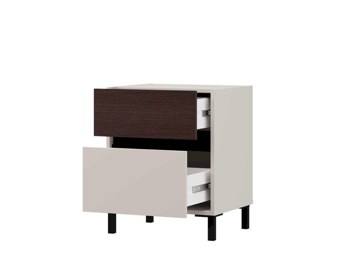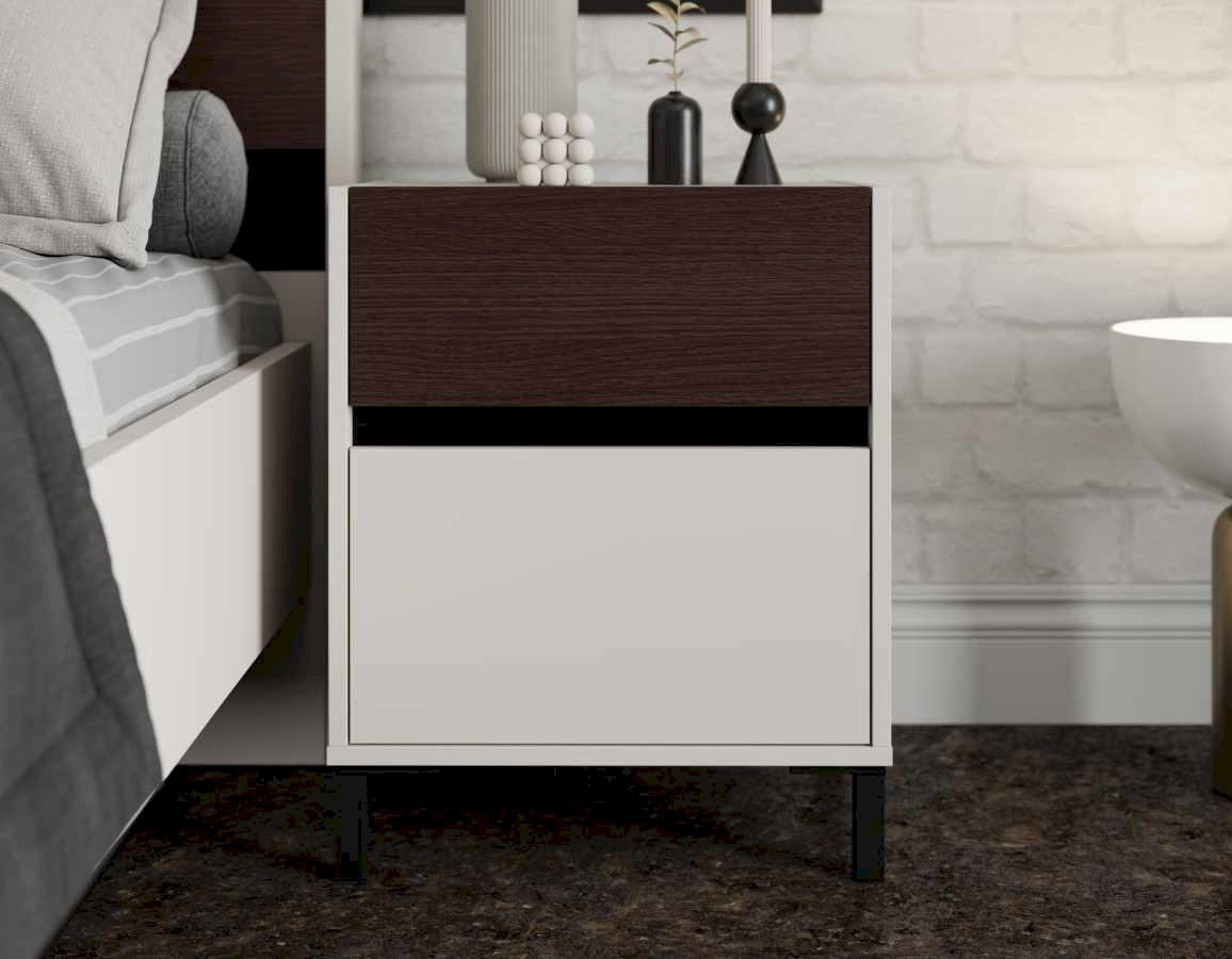 Noćni ormarić s dvije ladice modernog i minimalističkog dizajna s kontrasnim detaljima.