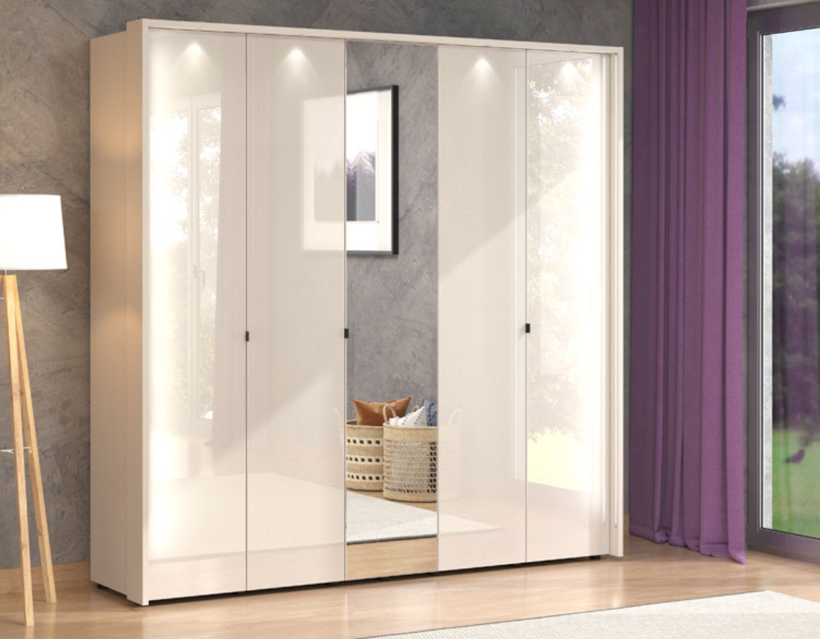 Funkcionalno dizajnersko rješenje za opremanje modernog ambijenta spavaće sobe. Ovaj ormar s pet vrata, s ogledalom u središnjem dijelu, doprinosi izraženoj estetici, eleganciji, ali i praktičnosti ambijenta spavaće sobe. Korisni prostor ovog modela sastoji se od šipki za ormar i pregrada.